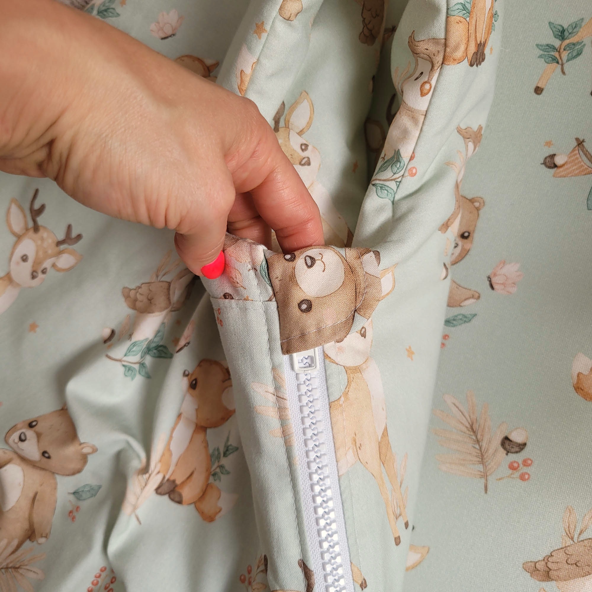 Śpiworek otwierany jest za pomocą bardzo dobrej jakości dwusuwakowego zamka, dzięki temu z łatwością można przebrać dziecko nawet podczas snu, lub wyjąć go bez wybudzania.