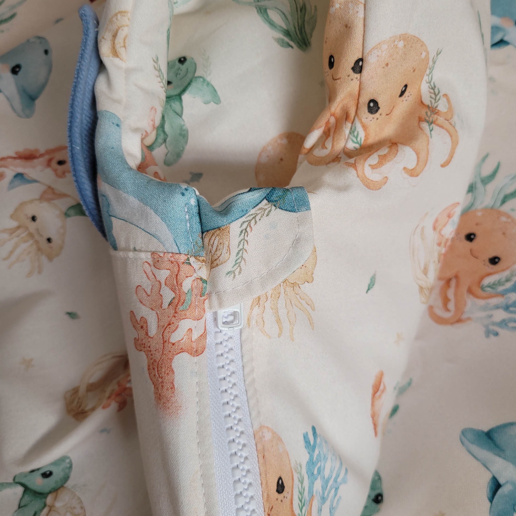 Śpiworek otwierany jest za pomocą bardzo dobrej jakości dwusuwakowego zamka, dzięki temu z łatwością można przebrać dziecko nawet podczas snu, lub wyjąć go bez wybudzania.