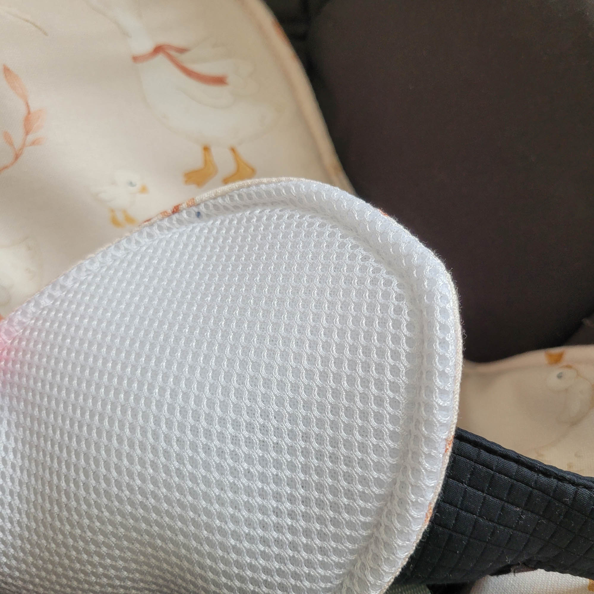 Warstwa siatki 3D tworzy przestrzeń wentylacyjną między dzieckiem a fotelikiem, co poprawia przepływ powietrza i zmniejsza nagrzewanie się ciała.